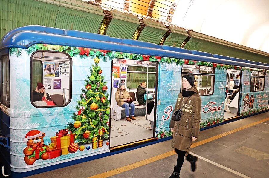 Брендированные новогодние составы появятся в столичном метро уже на следующей неделе. Об этом корреспонденту агентства «Минск-Новости» сообщил пресс-секретарь Минского метрополитена Андрей Дроб. Фото носит иллюстративный характер — Составы с нанесенными изображениями новогодних сюжетов будут курсировать по двум линиям метрополитена — Московской и Автозаводской — по одному на каждой, — уточнил А. Дроб. — На третьей линии пассажиры увидят красочные праздничные плакаты, которые украсят защитные экраны. Внутри вагонов будут звучать поздравления, а визуальное сопровождение к ним покажут на мониторах, которые размещены на станциях. Элементы новогоднего убранства вскоре появятся на кабинах инспекторов службы безопасности и в кассах. Накануне Нового года в столичную подземку традиционно спустятся Дед Мороз и Снегурочка. Сказочные персонажи начнут путешествие со ст. м. «Октябрьская». Они с удовольствием пообщаются с пассажирами, предложат вместе спеть новогоднюю песенку или прочесть праздничные