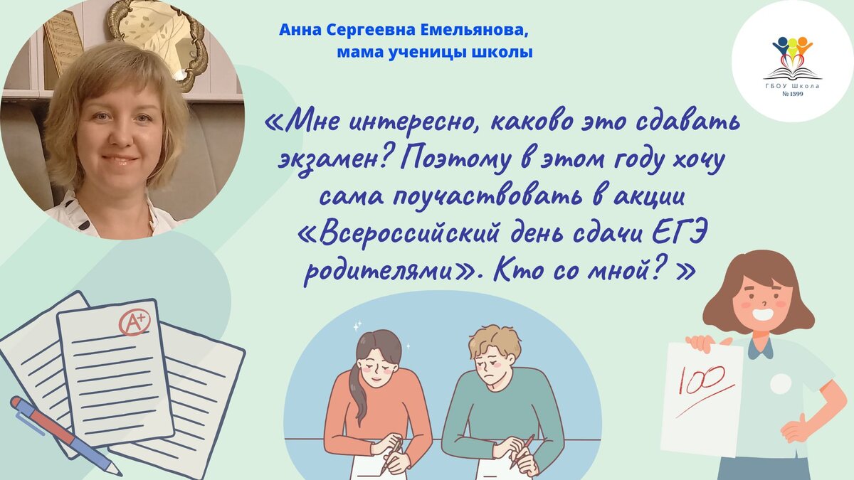🤔Мне интересно, каково это сдавать экзамен? И я хочу сама все проверить лично, хочу на несколько часов вернуться в школьные годы. Поэтому в этом году хочу сама поучаствовать в акции «Всероссийский день сдачи ЕГЭ родителями». Кто со мной? Присоединяйтесь, будем вместе пробовать сдать ЕГЭ», - говорит мама ученицы школы Анна Сергеевна Емельянова.