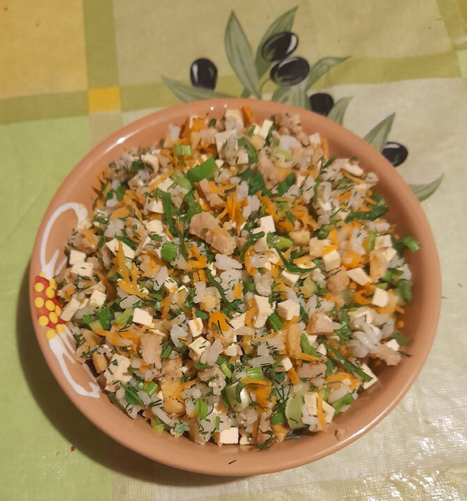 Варила уху из речного окуня. Рыбки попались с икрой. Сделала из нее салат. Икру подсолила и припустила на сковороде. Раскрошила готовую икру. Свежую морковку и коренья (можно сельдерей, петрушку, пастернак - на выбор или все вместе) натерла на мелкой терке. Тофу (соевый творог) нарезала мелкими кубиками. Зелень (у меня - зеленый лук, петрушка и укроп) мелко нашинковала. Все смешала и добавила отварную пшенку (можно булгур или полбу). Для заправки - смесь сметаны с горчицей или заправка из растительного масла с соком лимона, горчицей и солью. P.S. Тофу можно заменить на вареное яйцо. КБЖУ рассчитать не получилось, всё было «на глаз», но рецепт годится не только для диабетиков, но и для «худеющих». От наших друзей: Михаил Богдасаров, актер театра и кино, режиссер, Заслуженный артист России, на Радио Медиаметрикс Больше общения и рецептов - в группе "Рецепты для диабетиков" в ВКонтакте! Рецепт на странице Автор рецепта – Светлана Селянина © Почтенный возраст Online и Рецепты для диабетико