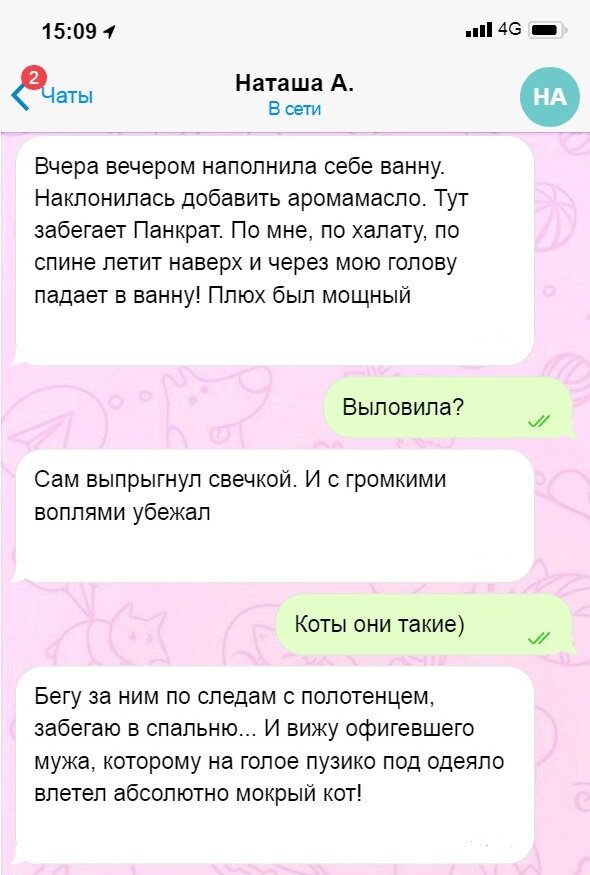 Каким бы смирным, мирным и умным не был бы кот, в его жизни всегда есть место веселым выходкам и проказам. Все хозяева и хозяйки котов это знают. Сегодня смешные переписки как раз о котиках. И их участии в жизни хозяек. Читаем? В этой семье живет черный красавец-кот Панкрат. Обычно он спокоен и царственен. Но... Да уж. Где лучше всего укрыться? У папы на пузике☺ Подруге пришлось уступить свою ванну мужу. А еще... муж не поверил, что Панкрат рухнул в воду сам. Муж так и сказал: "Кот умный, он не мог!". Панкрат сидел рядом и поддакивал. Заговор?!☺ Следующая переписка еще об одном проказнике - серо-полосатом Васеньке. Тут налицо сговор))) Называется: "Разыграй маму"))) Еще одна переписка. Но тут чудила хозяйка, а котик... молча страдал. Хочу уточнить, что этот котик недавно перенес диету, чем был очень недоволен. Представляете его ужас, когда он в своей миске вместо любимого корма нашел что-то странное?! "Нет, только не диета" - вопило подсознание котика. А сознание говорило коту, что "ес
