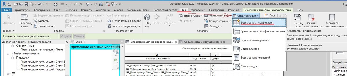 В данной Практике найдем все спецификации на все элементы, имеющиеся в модели. Работать будем в Revit 2020. Сейчас есть и более новые версии, однако большая часть проектов на данный период выполнены в этой. В Revit есть два основных вида табличного сбора информации: «Спецификации» и «Ведомость материалов». Сегодня будем использовать «Спецификации». Спецификации собираются по Категориям. Если составить «Спецификацию по нескольким категориям», то в ней отразятся не все категории и параметры. Почему так? А просто. Просто это надо принять и жить с этим. Однако, если будем работать в Revit 2022 в «Спецификацию по нескольким категориям» попадут ВСЕ категории. Здесь пропишу шаги, чтобы можно было создать спецификацию. Познакомится со спецификациями ближе можно Там)). Сначала определим какие спецификации нам собирать, чтобы все элементы имеющейся модели попали в них. Для этого создадим вышеупомянутую «Спецификации по нескольким категориям», как промежуточную. На ленте сверху выбираем вкладку В
