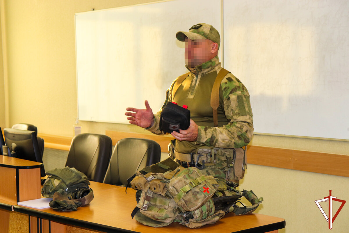 Во время мероприятия приглашенный гость акцентировал внимание ребят на личную и имущественную безопасность, подчеркнул важность наличия у каждого человека персональной аптечки. Росгвардеец привел примеры из тактической медицины, благодаря которым студенты узнали о методах применения подручных средств при оказании доврачебной помощи, способах остановки кровотечения в полевых условиях, правилах наложения жгута.
