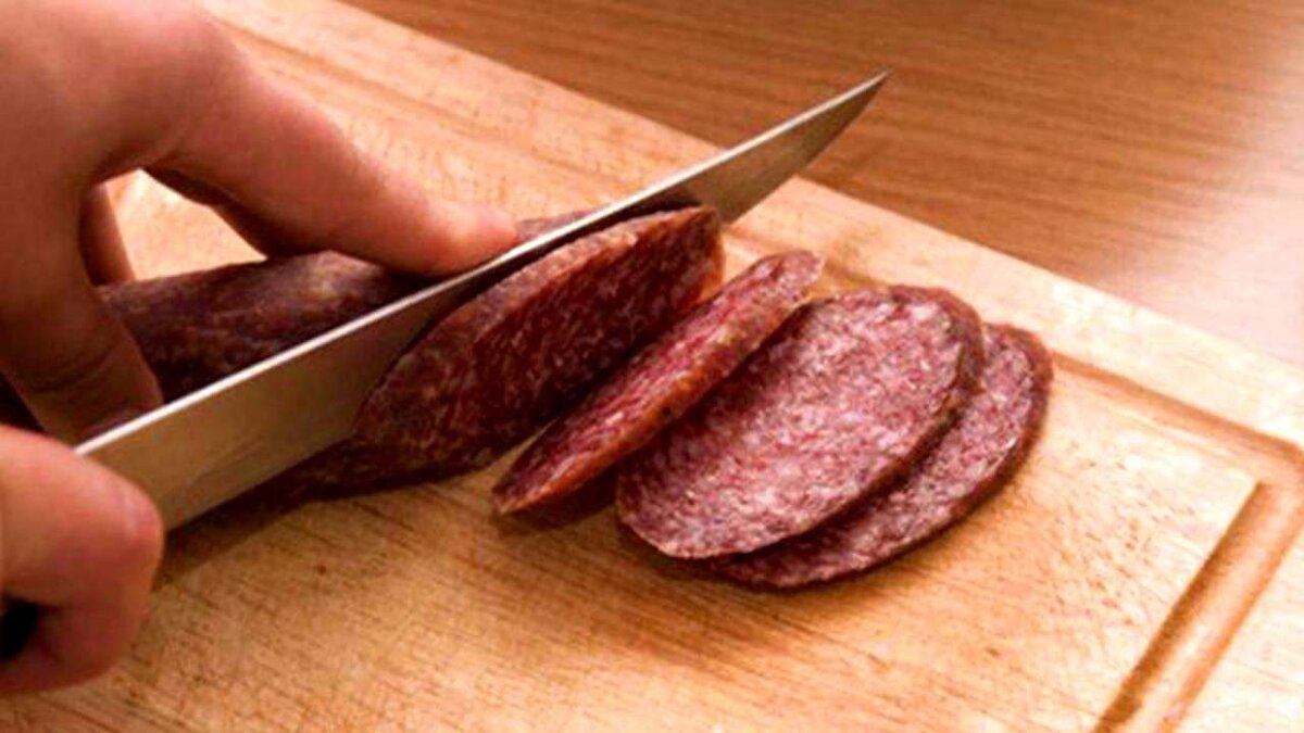Глеб на доске резал колбасу.