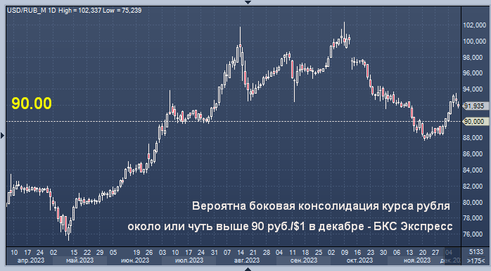Вероятна боковая консолидация курса рубля около или чуть выше 90 руб./$1 в декабре - БКС Экспресс Курс доллар/рубля на Мосбирже интервалами в 1 минуту Курс доллар/рубля на Forex интервалами в 4 часа Вероятен сценарий боковой консолидации курса пары доллар/рубль около или чуть выше отметки 90 руб./$1 в текущем месяце, пишет аналитик БКС Экспресс Василий Карпунин. "Фаза ослабления рубля остановилась. Пара USD/RUB в четверг откатилась обратно к 92 руб./$1 вместе с торможением распродаж в нефти. В базовом сценарии не ожидается какого-то сильного устойчивого тренда по доллару в декабре. Наоборот, вероятен сценарий боковой консолидации около или чуть выше отметки 90 руб./$1", - отмечает эксперт. MarketSnapshot - ProFinance.Ru в Telegram По теме: Курс рубля уже достиг своих лучших уровней — Альфа-банк Курс рубля резко взлетел после указа Путина