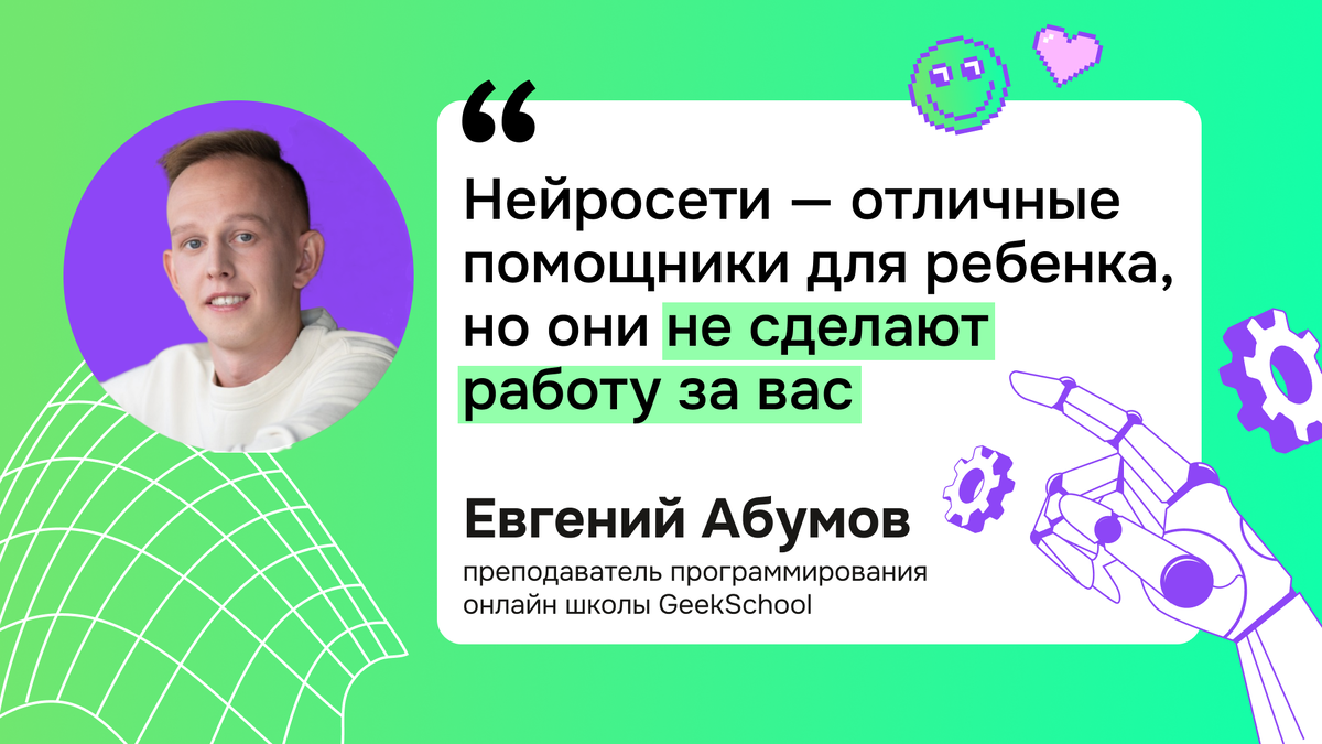 Я считаю, что важно преподавать детям одну очень простую мысль: нейросети - отличные помощники, но они сами не могут выполнить работу за вас. Вы можете воспользоваться ими, создав с их помощью шаблон, но они не заменят ваш творческий труд.
