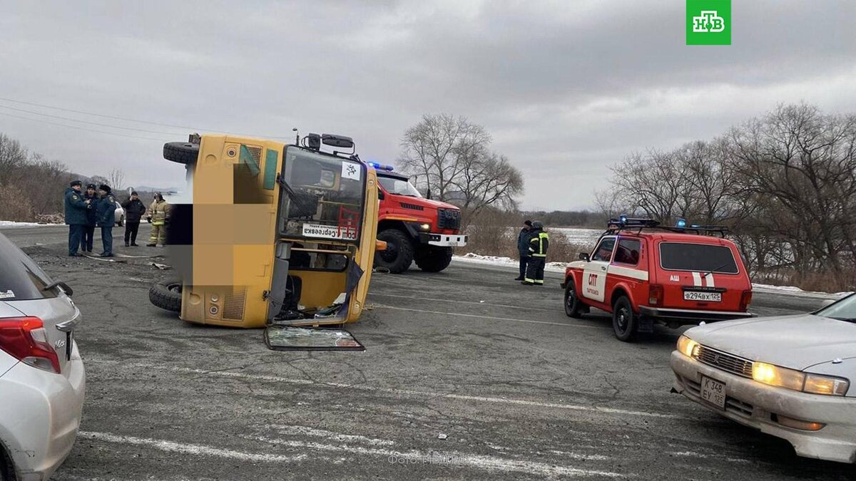 [ Смотреть видео на сайте НТВ ] В Приморское крае выясняют причины дорожной аварии со школьным автобусом. Автобус, в котором находился 21 ребенок, попал в ДТП в Приморском крае. После столкновения с легковушкой он завалился на бок. Предварительно, водитель автобуса, следовавшего с экскурсии, при повороте налево не уступил дорогу Toyota Sprinter. Дети были пристегнуты ремнями безопасности. Предварительно, пострадал один из них, а также водитель автобуса. [ Смотреть видео на сайте НТВ ]