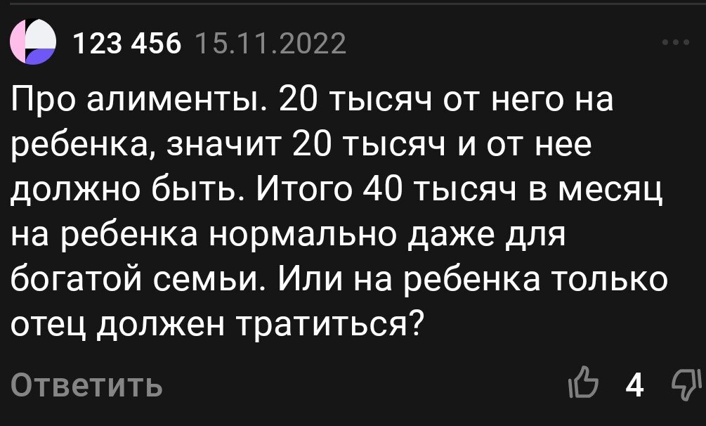 Это просто «праздник какой-то» ©, как говорил Карабас Барабас. Просто песня незамутненного инфантильного сознания! Такой вот комментарий был сделан к одной из моих статей, где и не про алименты вовсе, но, видимо, болит сильно у товарища. Чувство несправедливости прямо съедает изнутри 😊 Решила пояснить. Про справедливость-то вселенскую. Уж больно некоторые мужчины озабочены той самой несправедливостью. Точнее, несправедливости в алиментных делах они видят две. 1. Женщины выходят замуж только для того, чтобы потом родить, и на твои кровные алименты шиковать. Не работать, по Мальдивам разъезжать, любовника содержать, шубы покупать. И все это за кровные бывшемужние 20 000 рублей в месяц. Или 5000. Сумма не важна, важно ощущение несправедливости: а чего это я должен? Даже дикое сравнение в комментариях приводят: алименты после развода платить – это как платить страховку за машину, на которой не ездишь. Видимо, к ребенку такое же отношение, как к железяке, функциональное. Мол, какой от ребе