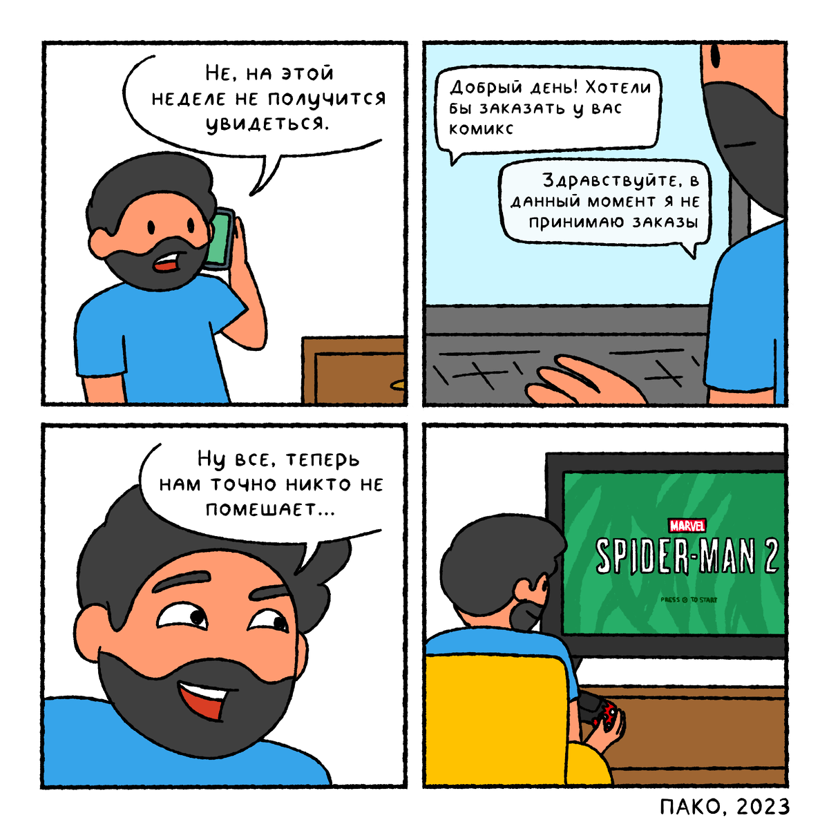 Новый год уже наступил и сейчас у меня есть как минимум одна приоритетная задача - выложить в этом блоге все свои новогодние комиксы, пока после праздников прошло еще не слишком много времени. Потому что потом будет уже не актуально. Кстати, на случай если вы забыли или не в курсе, то зовут меня Павел Пако и комиксами я занимаюсь с 2017 года. Рабочее название одного из проектов, который я веду, звучит как «Жизненные зарисовки» - это простенькие комиксы, в которых я рассказываю о своей жизни, делюсь своим мнением на разные темы и шучу про кино, игры и книги. Раньше всего эти комиксы появляются в моей группе Мозги трески, ну а здесь они выходят подборками по 10 штук. И только в подборках я комментирую каждый комикс и рассказываю историю его создания. Самой ожидаемой игрой 2023 года для меня стала Marvel’s Spider-Man 2 - я заказал ее сразу же, как диск появился в магазинах и сел проходить в тот же день, как забрал свой заказ. Собственно, этому событию и посвящен первый комикс подборки. Об