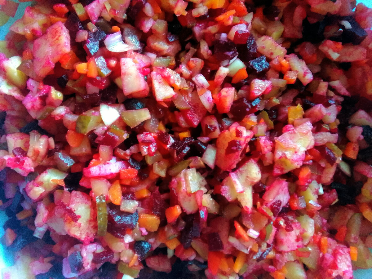 Винегрет, им никого не удивишь, Мамулик сегодня решила приготовить, какие ингредиенты, да они всем известны Свекла, морковь, лук, картошка, соленый огурчик или квашеная капуста, зеленый горошек, кто-то селедочку кладет. А нам нравится вместо горошка добавлять фасоль и еще французскую горчицу. Это очень вкусно, кто не пробовал, попробуйте так приготовить! Всем приятного аппетита! И будьте здоровы!