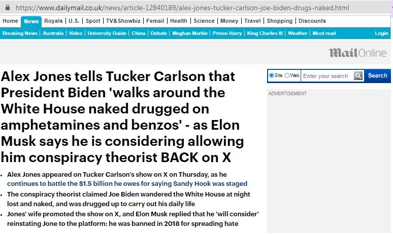 Есть в Америке такой очень известный и очень скандальный блогер, которого зовут Алекс Джонс. Занимается он тем, что вынюхивает все самые сокровенные тайны "звёзд", а затем выкладывает результаты своих "расследований" на всеобщие обозрение. Чем, естественно, неплохо зарабатывает. И в подтверждение его популярности достаточно сказать, что Алекса пригласил на одно из своих последних ток-шоу сам Такер Карлсон. И то, что блогер рассказал ведущему, настолько взбудоражило западные умы, что даже всемирно известное британское издание Daily Mail не смогло удержаться от публикации на страницах своей газеты: Согласно рассказу Джонса, у него имееется достаточно осведомителей в Белом доме, которые и выдали страшную тайну действующего президента США. Такер Карлсон в четверг транслировал интервью с опальным теоретиком заговора Алексом Джонсом, в котором Джонс заявил, что президент Джо Байден находится под действием амфетаминов и бродит по Белому дому обнаженным и потерянным посреди ночи. Самое интерес