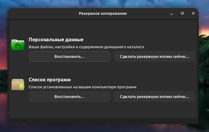 Иногда система начинает так безбожно глючить, что нет смысла ее чинить, а проще все сделать с нуля. Но за время работы система обрастает нужным нам софтом и разными настройками. Как к этому всему вернуться, затратив минимум времени? Идем в меню, там находим приложение резервное копирование. Начнем с сохранения данных и домашнего каталога. Приложение дает выбрать куда положить резервную копию, надо выбрать или внешний диск, или диск, который точно не будет отформатирован при переустановке системы. Скажем общий диск с Виндоувс, если у вас две системы. Далее вы можете исключить файлы иди каталоги, которые вам не нужны в резервной копии. А так же можете включить файлы и каталоги, которые не включены в копию по умолчанию. В том числе и скрытые. Лично мне нужно сохранить темы, иконки и файлы фотошопа Ждем. Теперь сохраним наши приложения. Программа предложит выбрать что сохранить. Обратите внимание, что файл сохраниться в домашней директории, перенесите его от туда. Отмечу Все програ