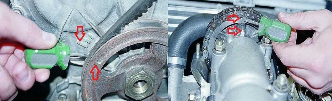 2. Установите метки ГРМ, используя ключ для проворота храповика.