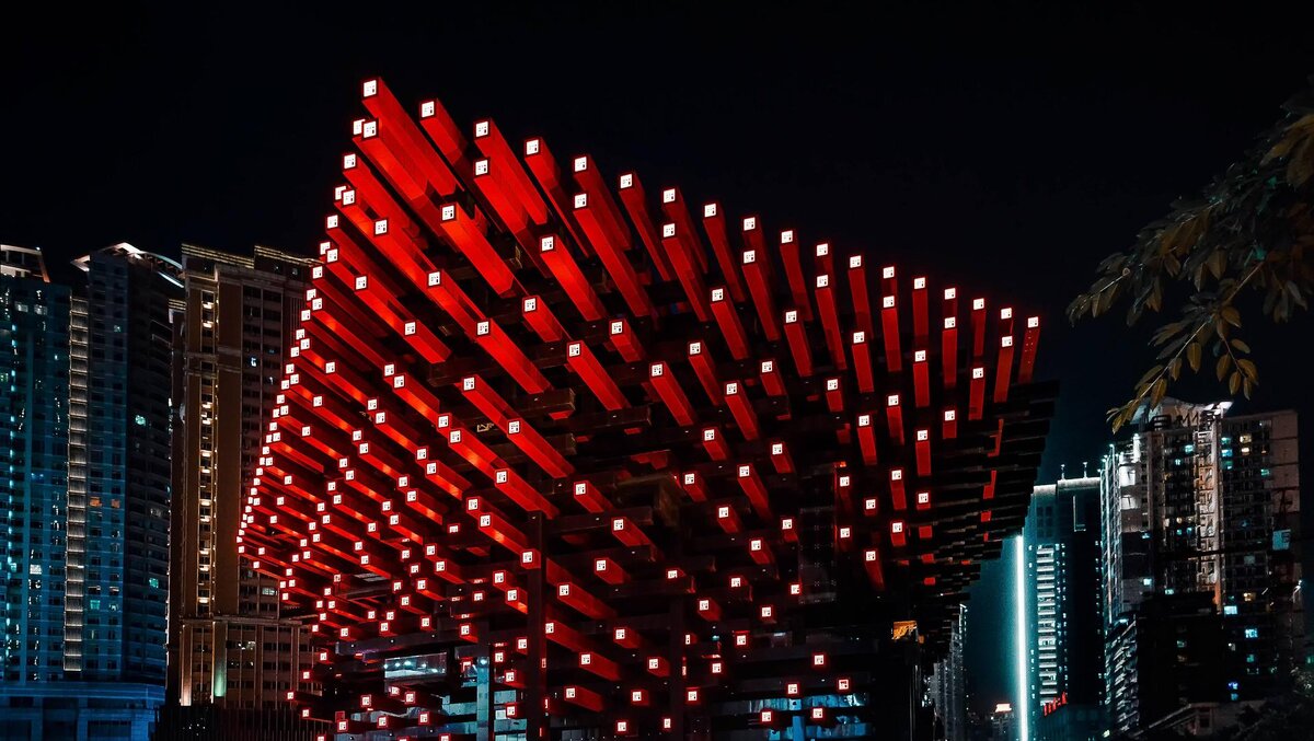 Ярко-красные и черные лучи подчеркивают эффектный и несколько угрожающий внешний вид центра искусств: кажется, будто балки фасада направлены прямо на прохожих. Хотя по замыслу авторов проекта эти детали отражают традиционные для китайской архитектуры элементы — окрашенные в красный цвет деревянные балки.