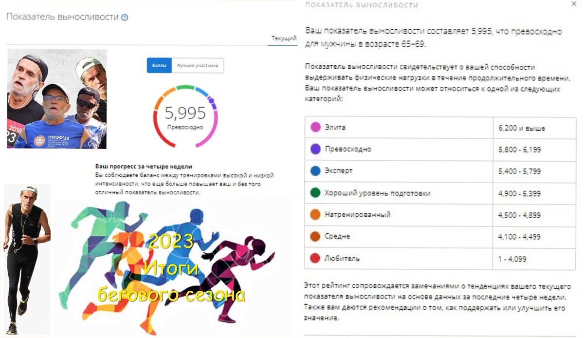 Мой показатель выносливости составляет 5,995, что превосходно для мужчины в возрасте 65–69. Показатель выносливости свидетельствует о способности выдерживать физические нагрузки в течение продолжительного времени. Получение показателя выносливости Чтобы получать данные о показателе выносливости, отслеживайте ваши занятия спортом в течение двух недель с помощью совместимых часов Garmin. В расчете его значения учитываются все зарегистрированные типы физической активности, но особенно сильно на него влияют занятия с аэробной нагрузкой. Показатель становится более точным по мере получения данных о большем количестве занятий. Расчет вашего показателя выносливости Для создания и улучшения базы выносливости необходимо время, а также регулярные и постоянные усилия. Однако самый высокий уровень выносливости может снизиться за относительно короткий период, если вы перестанете заниматься или будете выполнять меньше упражнений, способствующих улучшению выносливости. По этой причине для более точно