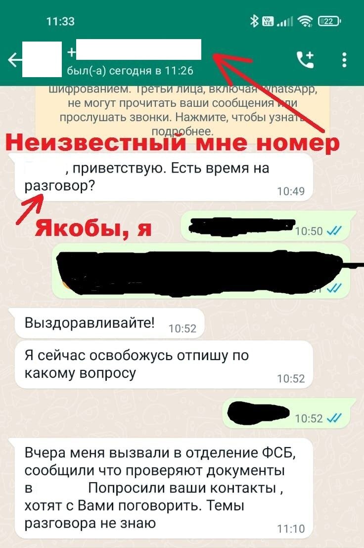 В Краснодаре 8 декабря появилась информация о мошенничестве через WhatsApp и Telegram. Злоумышленники фактически крадут вашу аватарку и пишут с различными просьбами вашим знакомым, добавляя, что ими интересуется ФСБ. «Пару дней назад мне начали звонить мои знакомые и говорить, что от моего имени их пытаются развести. При этом, и телеграмм, и WhatsApp у меня защищены и паролями, и двухфакторной идентификацией, и взломаны не были. Сегодня выяснилось, что пишут и звонят с чужого номера телефона, на котором моя аватарка и описание. Первый раз с таким сталкиваюсь. Хорошо, что знакомые все меня неплохо знают, поэтому не ведутся. И вы не ведитесь. А я пока посоветуюсь с полицией», - рассказал «Блокноту Краснодара» пострадавший мужчина. Он приложил скрин сообщения, которое было отправлено якобы от его имени его знакомой. Скрин «Вчера меня вызвали в отделение ФСБ, сообщили что проверяют документы. Попросили ваши контакты, хотят с Вами поговорить. Темы разговора не знаю», - именно такой текст со