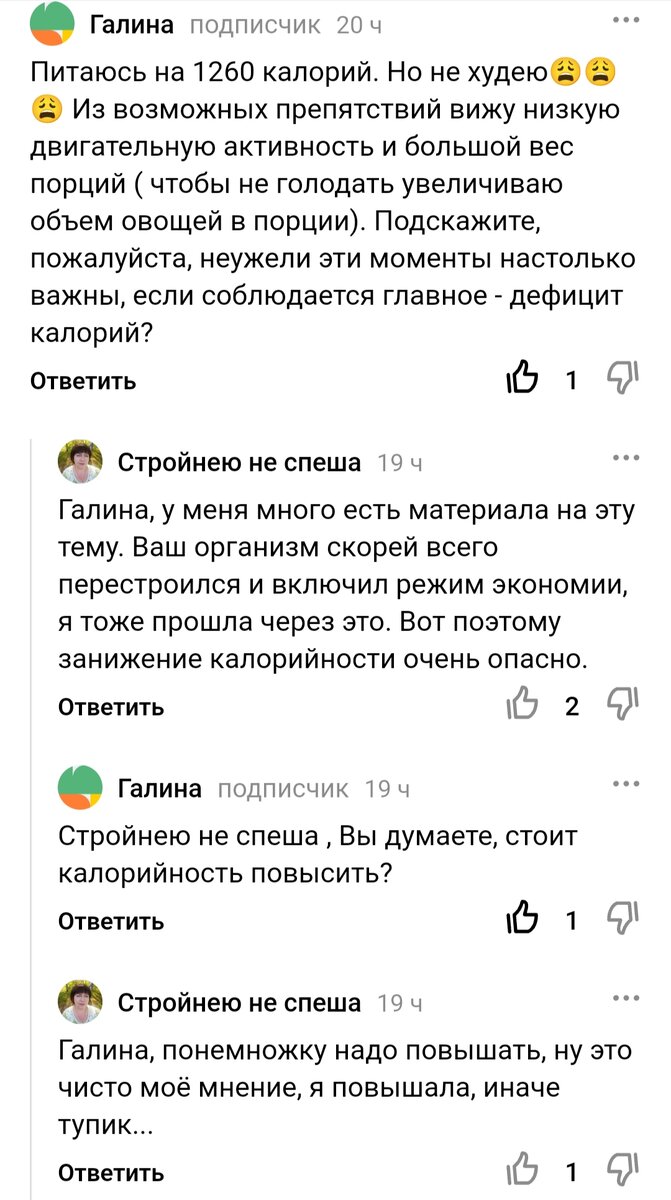Привет 👋 всем ! Друзья мои, я просила вас задавать мне вопросы на темы похудения и не только, обещала всем ответить, а обещания я обычно выполняю . Тем более, что сегодняшний вопрос очень серьёзный и животрепещущий. Я много раз писала и снимала на эту тему, но мне несложно ответить ещё раз. Напоминаю, что я не доктор, не диетолог, но как вечнохудеющий человек накопила большой личный опыт в этой теме и изучила много информации в этой области и делюсь этим с вами. Вот давайте разбираться. Если мы хотим похудеть, значит у нас лишний вес, что это значит ? Значит накопился он у нас не просто так, а потому что приход и расход энергии или килокалорий ( кк ) у нас были разными, преобладал приход , то есть у нас был профицит энергии. И организм копил энергию " про запас " в жировых депо. Чтобы похудеть ,нам нужно создать дефицит кк. И что мы делаем ? Мы думаем, чем меньше мы будем есть, то есть получать кк, тем быстрее мы похудеем. Поначалу это работает. Но ! Живой организм это не простейшая