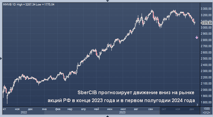 SberCIB прогнозирует движение вниз на рынке акций РФ в конце 2023 года и в первом полугодии 2024 года График индекса Мосбиржи интервалами в 1 день Аналитики SberCIB Investment Research прогнозируют коррекцию вниз российского фондового рынка в конце текущего года и в первом полугодии следующего на фоне роста доходностей ОФЗ и "навеса" акций после редомициляции некоторых компаний, сообщается в материале компании. "Однако во втором полугодии 2024 года мы прогнозируем восстановление рынка акций РФ и рост индекса Мосбиржи до 3 500 пунктов", - указывают эксперты Сбербанка. MarketSnapshot - ProFinance.Ru в Telegram По теме: Куда бы мне хотелось, чтобы упал индекс Мосбиржи Курс рубля резко взлетел после указа Путина Индекс Мосбиржи может снизиться как минимум на 10% — «Финам»
