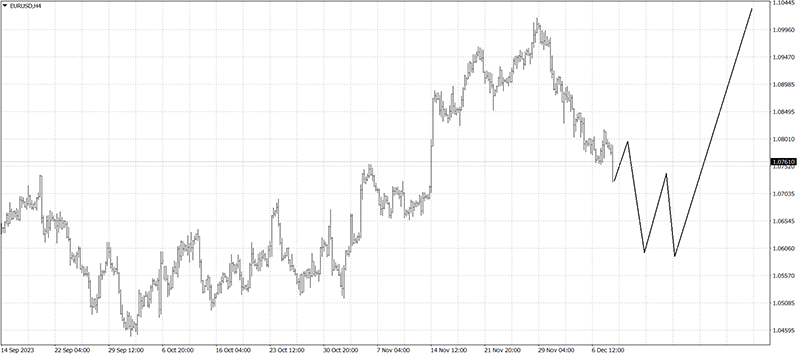 По ним же построил предполагаемые векторы движения EURUSD на четырехчасовом графике.