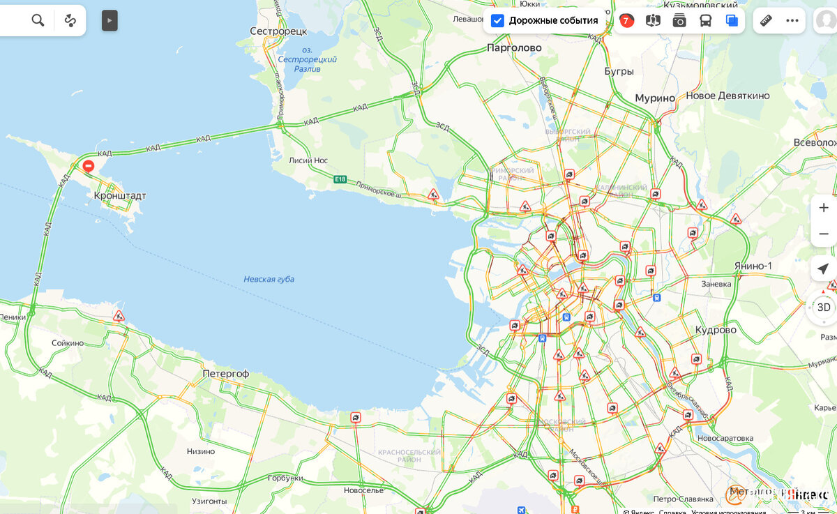 Петербург заранее обрастает пробками: на дорогах плотнее обычного Час пик еще не настал, а пробки на дорогах Петербурга уже достигли вечерних значений. Трафик в городе к концу дня 8 декабря на 1 балл плотнее обычного, и в ближайшее время заторы начнут расти еще сильнее. По данным «Яндекс.Пробок», к половине пятого часа вечера петербургские улицы оказались загружены на 7 баллов, тогда как обычно в это время в пятницу наблюдается шесть. С 17 часов они начнут расти, и к 18 часам ожидается «восьмерка». Пока горожане только начинают разъезжаться с работы, плотные пробки в основном сконцентрированы в центре и на Петроградской стороне. В частности, до багрового покраснели на карте улицы в районе площади Восстания, Литейный проспект, набережная Фонтанки, Садовая улица, Каменноостровский проспект, Большой проспект П. С., Чкаловский проспект. Уже плотно на набережных — Свердловской, Арсенальной, Пироговской и Выборгской. Лесной и Большой Сампсониевский проспекты успели обрасти заторами в направл