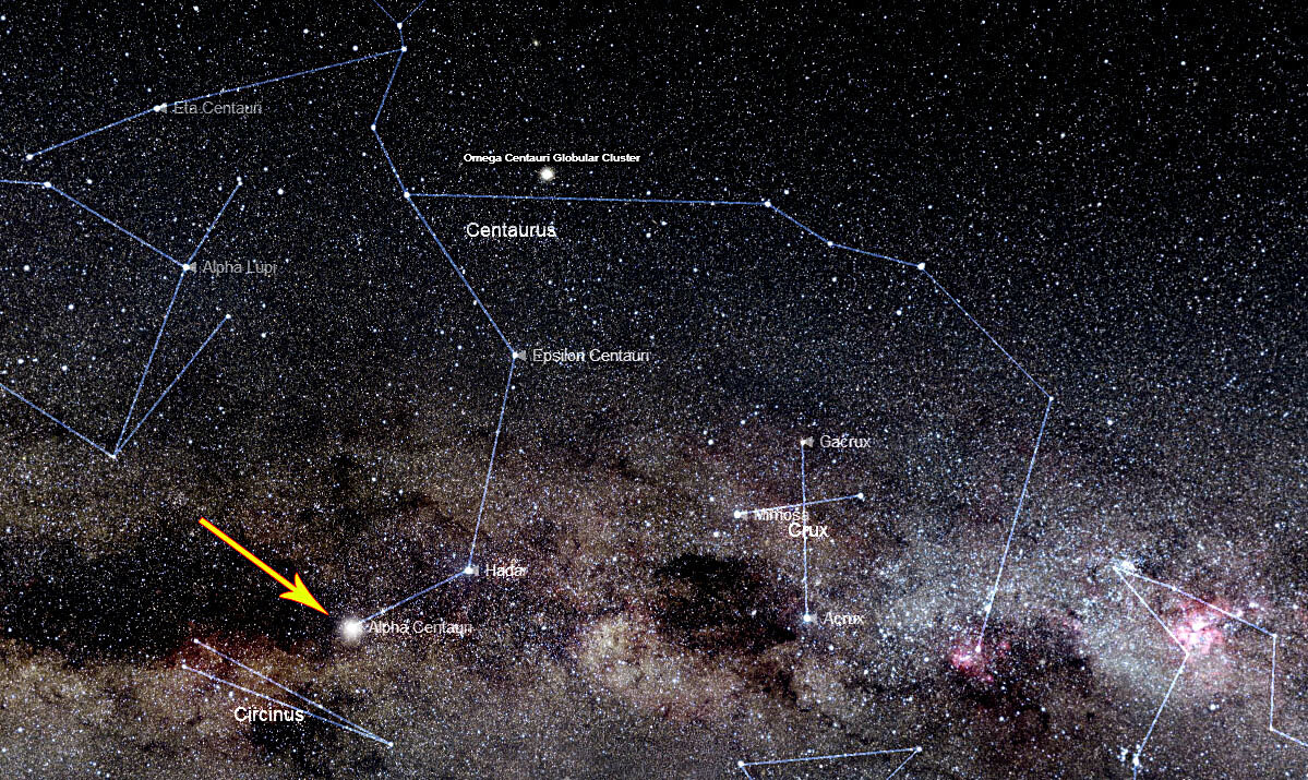 Альфа Центавра располагается максимально близко к Солнцу по сравнению со всеми остальными звездами. Именно поэтому многие из тех, кто питает надежды на контакт с внеземным разумом питают огромный интерес к Альфе Центавре. Не смотря на то, что признаков жизни в районе светила не обнаружено, Альфа Центавра — это очень интересный для изучения и наблюдения объект. Общие сведения об Альфе Центавра Не смотря на то, что с Земли Альфа Центавра выглядит одиночной звездой, она включает в себя целых три компонента. Вокруг общего центра масс вращаются две подобных Солнцу звезды — Альфа Центавра А и Альфа Центавра B, а также Красный Карлик - Проксима Центавра (Альфа Центавра С). Альфа Центавра — звезда Южного полушария звездного неба. Это значит, что из Северного полушария Земли ее увидеть нельзя. Звездная система Альфа Центавра — ближайшая к Солнцу, а самый близкий компонент — Проксима Центавра. Возраст тройной системы примерно равен 6-ти миллиардам лет, в то время как Солнечная Система существует