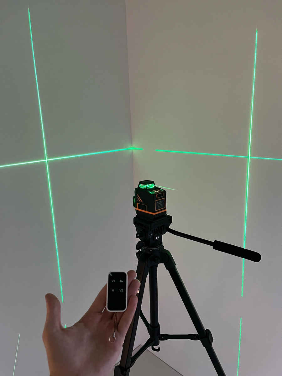 Лазерный уровень работает в трех проекциях, формируя 12 линий зеленого цвета в режиме 3D, угол развертки лучей составляет 360 градусов по горизонтали и вертикали. Благодаря яркому зеленому лучу видимость сохраняется на высоком уровне практически в любых условиях, для удобства использования предусмотрена регулировка яркости (4 режима). Запускать прибор можно на расстоянии с помощью пульта дистанционного управления. Дистанция работы – до 30 метров. Достичь максимальной точности помогает встроенный механизм компенсации, за счет которого производится самовыравнивание лучей, а также применение лазерной мишени (в комплекте).