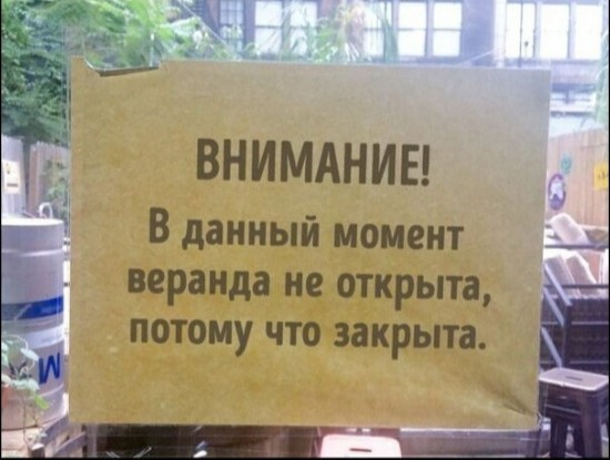 А ведь логично, не открыта потому что закрыта... всё предельно просто и доходчиво. Предлагаю вашему вниманию несколько забавных изображений, в которых не надо искать какой-либо логики, просто нужно улыбнуться и порадоваться за людей, которые изображены на этих фото, или являются их авторами. Ведь как не порадоваться за участников ДТП, которые вместо традиционных выяснений кто прав-кто виноват, просто налепили снеговиков и, по-видимому, в прекрасном расположении духа в ожидании представителей ГИБДД... \\\\\\\\\\\\\\\\\\\\\\\\\ А это классная отмазка на все случаи жизни. Ведь у каждого человека есть такие моменты, когда просто необходима очень-очень важная причина, чтобы объяснить свой косяк, опоздание или нежелание трудиться в такой-то день... Главное вызубрить дату и страну, а то вдруг попадётся дотошный руководитель, проверит и наступят последствия). \\\\\\\\\\\\\\\\\\\\\\ Таинственные изделия по доступной, даже бросовой, цене. Можно, конечно, по смыслу догадаться какие это выпечные