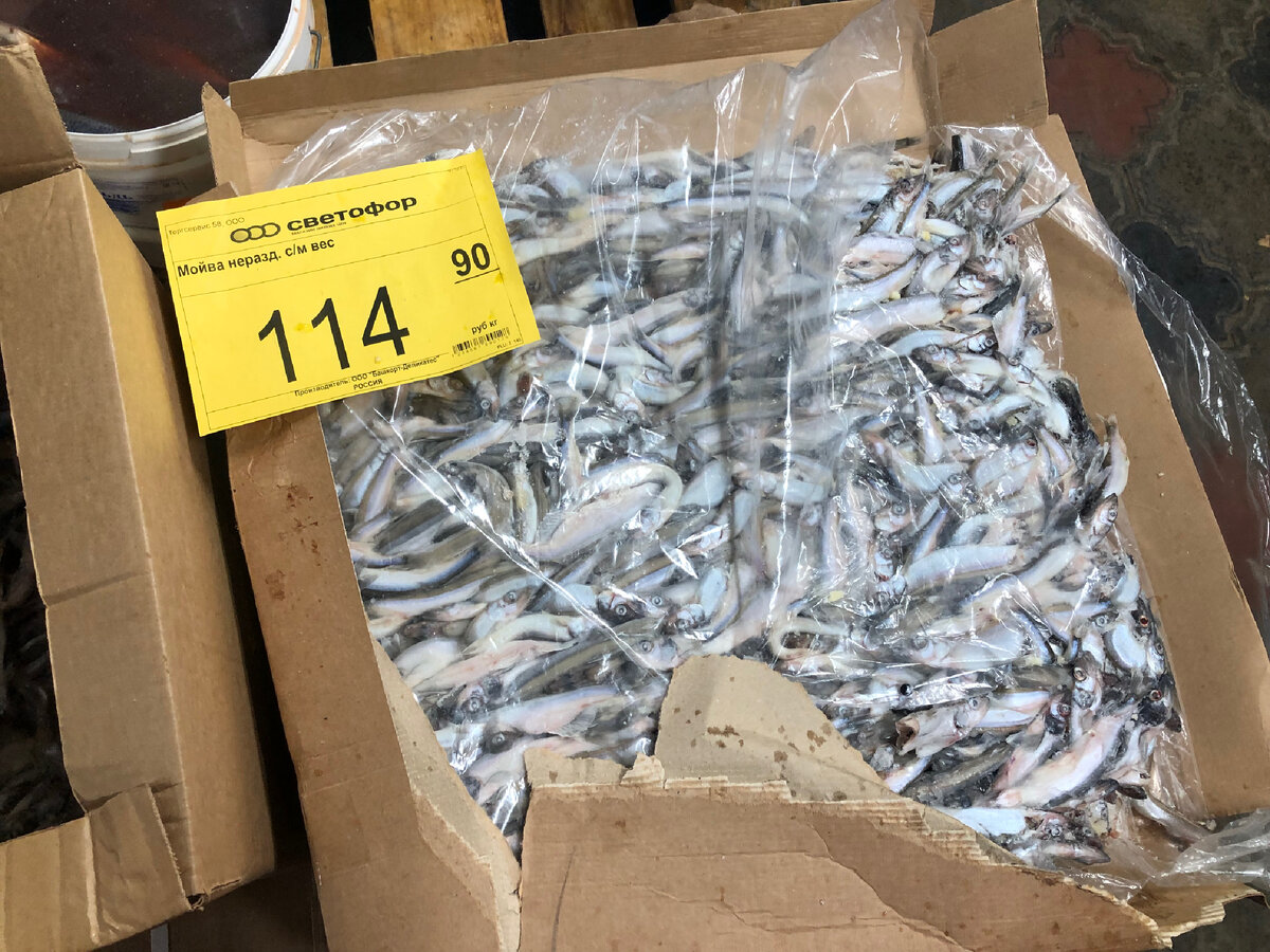 Ой, сколько всего привезли. Мойва по 114 рублей! В магазине Светофор негде пройти, все заставлено товаром.