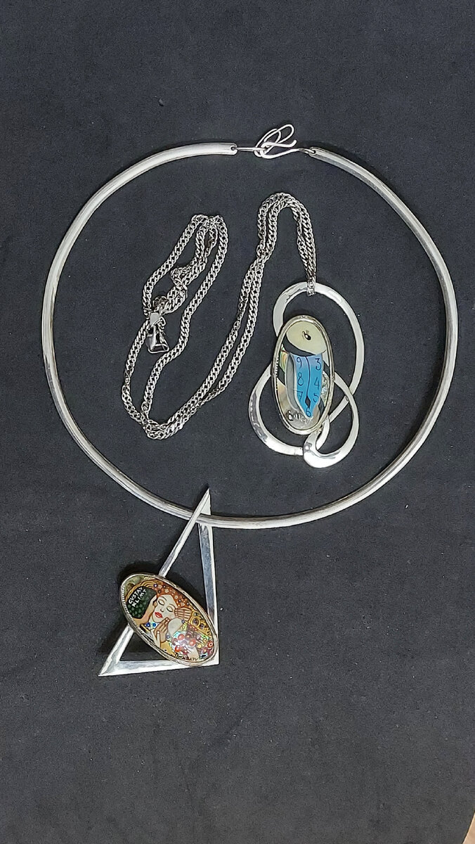 Всем доброго дня и отличного настроения! Снег укутал землю тёплой шубой, нарядил деревья в белую фату. Вокруг морозная чистота и свежесть. Сердце предвкушает новогодние чудеса. А мы чувствуем себя новогодними эльфами, создающими волшебные подарки 😁 Как же это радостно - делать то, что любишь. И любить то, что делаешь! И сегодня мы представляем вам ещё 2 серебряных кулона, созданных с любовью и радостью. "Поцелуй" Густава Климта". Его вы видите на фото чуть выше. И кулон "Постоянство памяти" Сальвадора Дали", который представлен на следующем фото. А у меня для вас 2 новости, плохая и хорошая 😁 Начну с плохой. Украшения выполнены на заказ, поэтому не продаются. А завершу публикацию хорошей новостью!🍀 МЫ РАБОТАЕМ НА ЗАКАЗ👌 Пишите, кому это интересно 😉