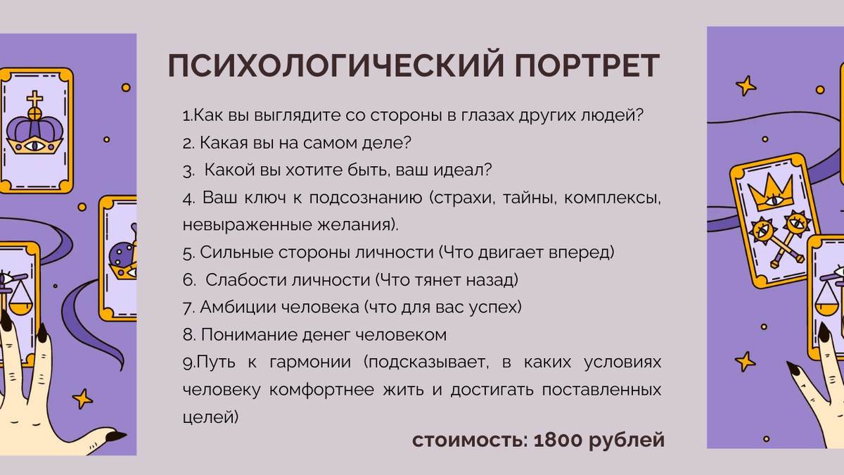 Стоимость расклада: 1800 рублей или вы можете сделать его частью индивидуальной экспресс-консультации. Стоимость консультации - 2500 рублей (30 минут).