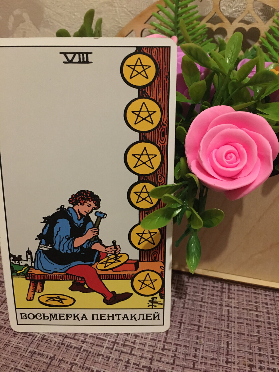 Здравствуйте дорогие мои. Прекрасного вам дня! Даже одна карта несёт в себе нескончаемый поток энергии и информации. Целью данного расклада является то, что мы узнаем, как сложится ваш день, какие события возможные он принесёт, и если прислушаетесь к советам карты, то можно улучшить этот день и избежать неприятных ситуаций. Восьмерка Пентаклей Эта карта предвещает надёжное продвижение вперёд в делах. Она указывает, что вы движетесь в правильном направлении и благодаря своим трудам добьётесь тех благ, на которые рассчитываете. Карта созидания, где вы правильно распределяете свою энергию и навыки. Карта подчёркивает важность дисциплины, планирования. А также указывает на приобретение новых навыков и знаний, которые помогут вам в достижении своих целей. В рабочих делах карта указывает, что вы движетесь в нужном направлении, а также начало какого-то перспективного проекта. А также ваши труды и таланты начнут приносить хорошую прибыль. В личных отношениях карта показывает, что если работат