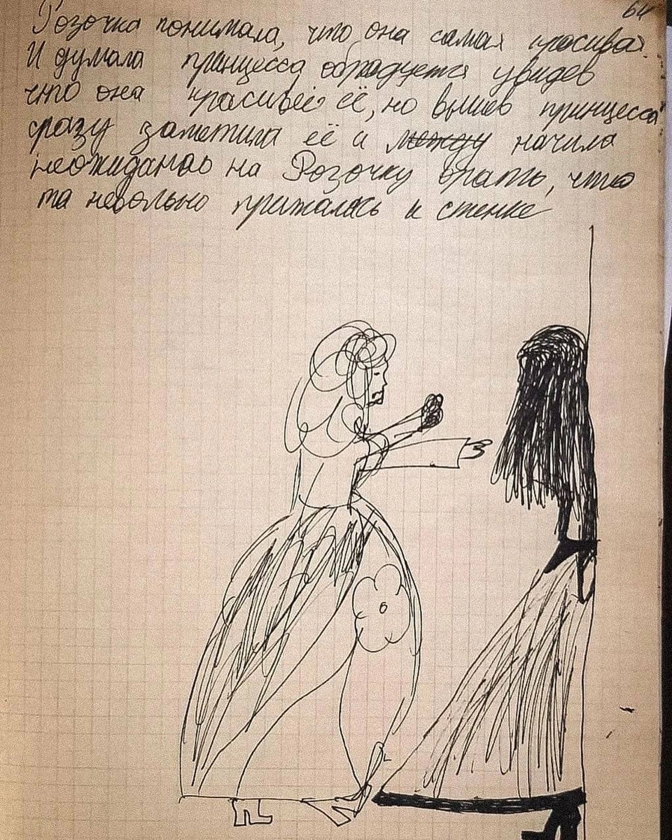 [Это произведение я написала в свои 10 лет... Любовный роман о девушке Розочке. Даже с конфликтом, кульминацией и эпилогом!!! А вот с мотивацией бы поработать... Вступление папа не нашёл, действия развиваются сразу с проблемы (все как я люблю😂)] Розочка понимала, что она самая красивая [Самая? Не нарциссизм ли случаем?]. И думала, что принцесса обрадуется, увидев, что она красивее ее [ну да, ну да. Логика!]. Но принцесса сразу заметила ее и между (зачеркнуто) [что же 10летняя Марина хотела сказать?] начала неожиданно на неё орать, что та [Розочка, судя по картинке] невольно прижалась к стене [Почему у Розочки поверх юбки трусы? А у принцессы оторвана кисть руки?]. ⠀ Розочка расплакалась и убежала. Красивая принцесса по имени Кудряшка (она была кудрявая) [Марина, да ты кэп!] решила ещё выбрать жениха. Всем принцам, конечно, понравилась Розочка [автор, уточни, почему «конечно», а то я за 20 лет забыла]. Да и полюбили ее, но они понимали, что родители на них разозлятся и выгонят [Розочк