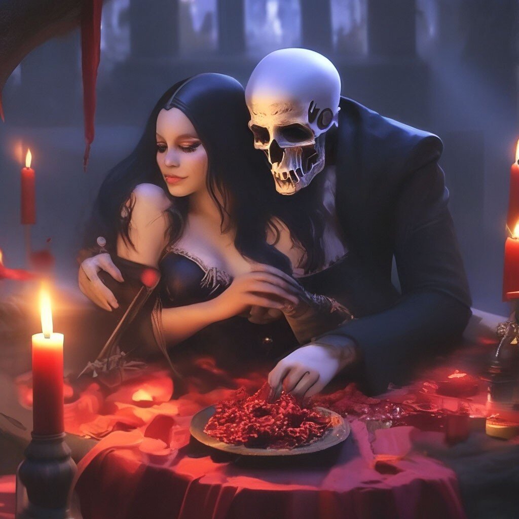 Жуткий жених из преисподней начал читать поочередно заклинания.После первого заговора, он небрежно бросил тело Василисы возле дурно пахнущей тиной воды,в камыши и продолжил обряд посвящения.Он выдрал с корнем один из камышей и стал растирать его между своих передних жучиных лапок.Монотонно бубня следующий темный заговор ,он снова капнул ядом и камыш загорелся как факел.В ту же минуту его обступили дьяволята и забрали горящий камыш,который бросили в ритуальный хворост.Столб огня метра в три взметнулся в небо,освещая кроваво-красным заревом лес.Завыли волки,закаркали столетние вороны,где то в чаще заревел страшным рыком медведь.