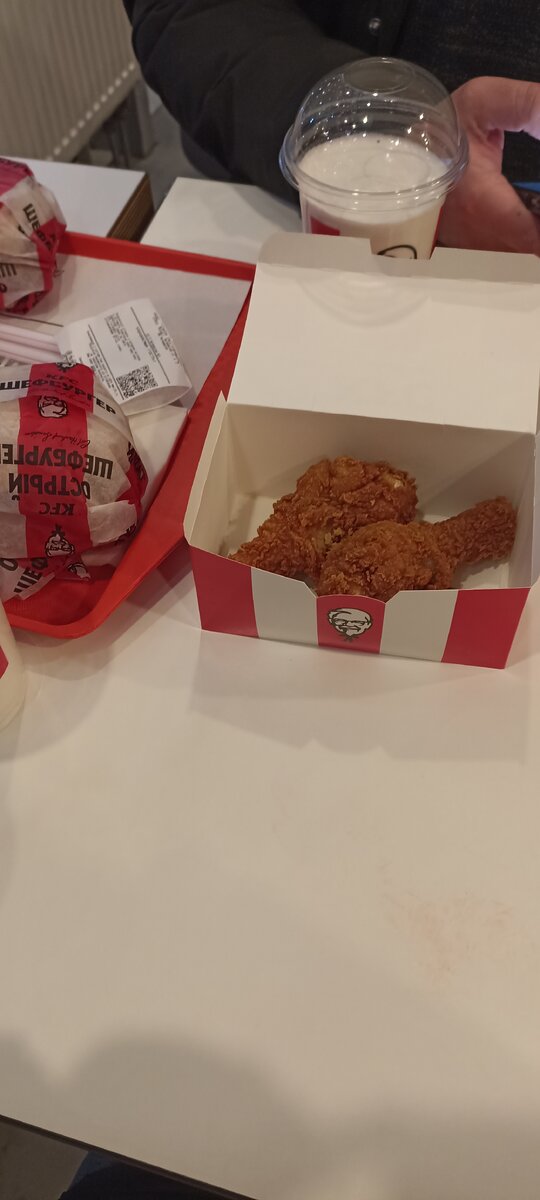 Начну по порядку, о прошедшем вчерашнем дне. В общем пошли вчера ночью с другом в КФС. Там просто была тема, которую хотелось обсудить. Насчёт квартирной жести, которая происходит со вторым другом. Там он вроде решился всё-таки ипотеку брать, но есть некие трудности. А трудности эти связаны с финансами. Ну, денег нет. Поэтому он хочет продать землю за городом, чтобы заплатить за первый взнос. Но это не суть. Сначала хотели на улице обсудить, но холод такой, что погибнуть можно было уже сразу там. Поэтому было принято решение идти в КФС. Пришли, заказали вот такую шляпу: 2 куриные ножки, шефбугрер, и ванильный коктейль. Каждый. Ели, обогревались, обсуждали проблемы друга. Всё нормально. Потом когда уходили, решили и домой взять по бургеру. Я за каким-то чертом решил взять сразу два. Типа на следующий день оставлю, чтобы ничего не готовить. Но, не удержался, и всё съел по приходу домой🤭. Вот так я худею. Смотрел фильм и поглощал пищу. И я так облопался, что аж плохо стало😅. С диван
