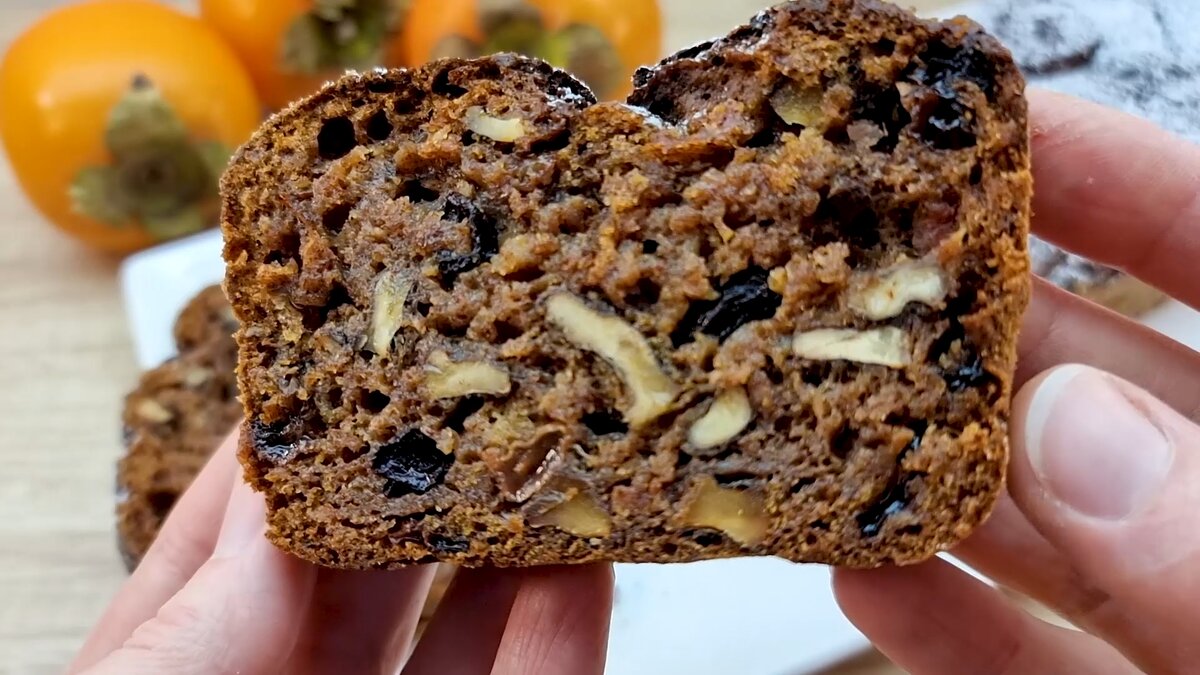 Хурму измельчить в блендере до однородности В миску для теста разбить яйца, добавить сахар, ванильный сахар (или ванильную эсенцию), щепотку соли и все хорошо взбить миксером до пышности В яично-сахарную смесь вылить измельченную хурму, растопленное сливочное масло и опять все хорошо размешать миксером до пышной однородной массы В эту смесь всыпать просеянную муку, корицу и разрыхлитель для теста, миксером размешать до получения однородного полу-густого теста Грецкие