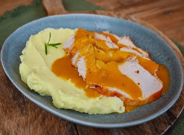 Тонко нарежьте грудку индейки и подавайте с картофельным пюре. Не забудьте добавить много соуса поверх мяса.