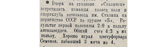 Вчера на стадионе «Сталинец» встретились команды хозяев поля и спортклуба автозавода им. Сталина на первенство СССР по группе «Б». Результат первой половины 2:0 в пользу автозаводцев. Общий счёт 4:2 в их пользу. Хорошо играл центрфорвард Семёнов, забивший 3 мяча из 4. «Красный спорт»
