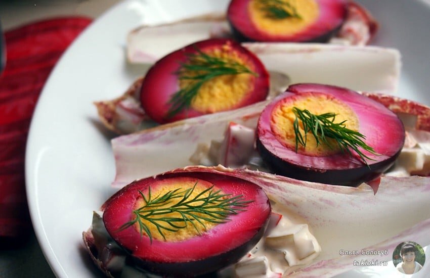 4. Перед использованием маринад слить, яйца разрезать пополам, вынуть желтки;