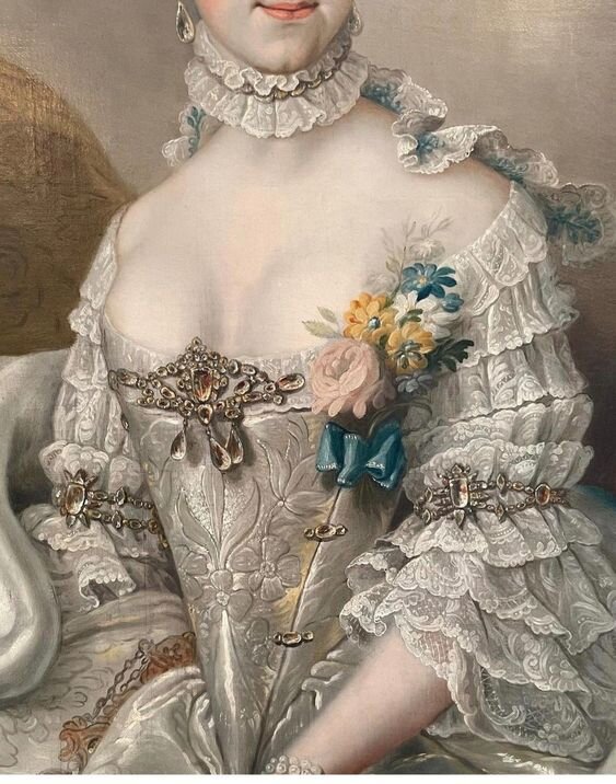 Парадное платье-мантуа готово и уже едет в новый дом. Некоторые тонкости его создания можно посмотреть в подборке. А также там собраны все посты и статьи на тему 18 века. Прежде, чем показать финальные фото наряда, напомню с чего всё начиналось. Конечно, первопричина - это заказ на такой наряд. Заказчик хотел платье в стиле 18 века с большими боками и большой корсажной брошью. Платье должно было быть в нежных пастельных тонах, которое сочеталось бы по цветовой гамме с серо-голубыми глазами куклы. В это время само небо, в буквальном смысле этого слова, послало весточку. В своих запасах я нашла подобные ткани и брошь, которая давно уже ждала своего часа. Она была куплена специально под кукольные наряды. Заказчику такая цветовая схема понравилась, и я начала собирать паззлы. В процессе демонтажа застежки брошь удачно раскололась на две части, которые пошли на корсаж и на украшение прически - эгрет. Корсаж на шнуровке, которая находится на спинке. Шнуровку эффектно маскирует шлейф, котор