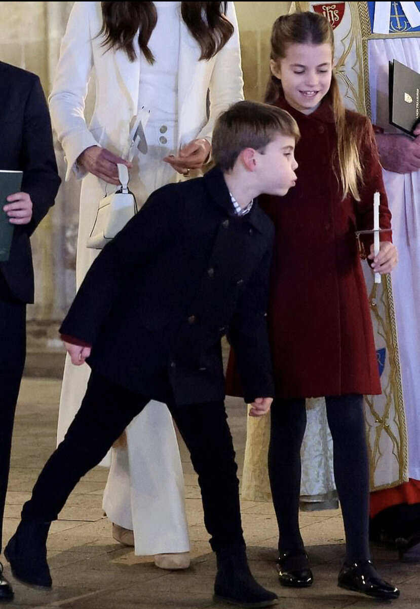 Вчерашний выход семьи Уэльских на праздничную службу сам по себе интересен. Но все ждали Луи. Младший из Уэльских вытянулся и стал ещё больше похож на отца Кэтрин в детстве. И вот наш герой, ставший в одночасье знаменитым после того, как показал два года назад весь репертуар на трибуне с мамой и папой, старался, как мог, быть серьезным. Но сложно удержаться, когда встречаешь Щелкунчика. Или срочно нужно задуть свечку. Папа с мамой помнят старый принцип нянь- ни за что не отпускать руку озорника. Поэтому принц Уильям старался. Принцесса Кэтрин следила за младшим с любовью. Луи очевидный любимчик! Конечно, Джордж повзрослел, а Шарлотта, которую считают заводилой среди этой тройки, приглядывала за Луи. Как и его старшие брат и сестра , маленький принц опустил перед колядками в Вестминстерском аббатстве письмо Санта Клаусу.