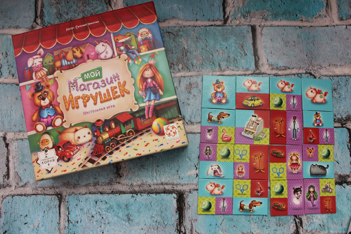 Яркую, красочную и очень милую игру **"Мой магазин игрушек"** я купила для Лизы (6,5 лет), но утром мне ее принес Тема (3,11 лет) . Причем, приносит он многие игры, которые ему не по возрасту, мы начинаем, а он так сказать "сливается" в процессе игры. Раньше я расстраивалась и думала, что человек просто не любит настолки, но нет, он продолжает приносить эти коробки и опять не досиживать. Значит , игра не его , точнее не по возрасту. Итак, он принес мне игру **"Мой магазин игрушек"**. Суть игры: выкладывать вокруг касс свой магазин игрушек, соединяя поля с одинаковыми цветами. За каждое соединённое такое поле игрок получает деньги , количество которых зависит от количества игрушек на этом поле , например, фиолетового, зелёного, красного или бирюзового цвета. В этот раз Тема высидел до конца, но на подсчёте очков просто бросил свой магазин и сказал, что дальше считать не хочет. А потом, после подсчёта очков спросил: выиграл ли он? Я ответила, что не знаю, так как его очки мы не счита