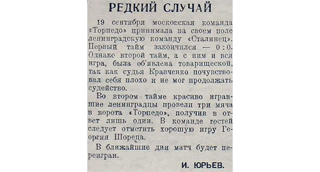 Запись в протоколе: «Во время игры судья тов. Кравченко почувствовал себя (беспрерывная рвота) плохо и игра была прекращена. Судья был отвезён каретой скорой помощи в больницу». Судя по всему, по этой причине после протеста «Торпедо» результат был аннулирован, и матч переиграли 18.10.1937. РЕДКИЙ СЛУЧАЙ 19 сентября московская команда «Торпедо» принимала на своём поле ленинградскую команду «Сталинец». Первый тайм закончился – 0:0. Однако второй тайм, а с ним и вся игра, была объявлена товарищеской, так как судья Кравченко почувствовал себя плохо и не смог продолжать судейство