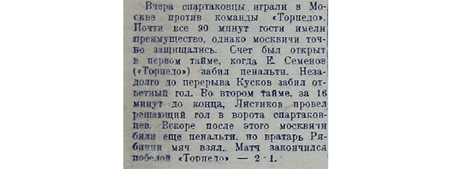 Вчера ленинградские спартаковцы играли в Москве против команды «Торпедо». Почти все 90 минут гости имели преимущество, однако москвичи точно защищались. Счёт был открыт в первом тайме, когда Е.Семёнов («Торпедо») забил пенальти. Незадолго до перерыва Кусков забил ответный гол. Во втором тайме, за 16 минут до конца, Листиков провёл решающий гол в ворота спартаковцев. Вскоре после этого москвичи били ещё пенальти, но вратарь Рябинин мяч