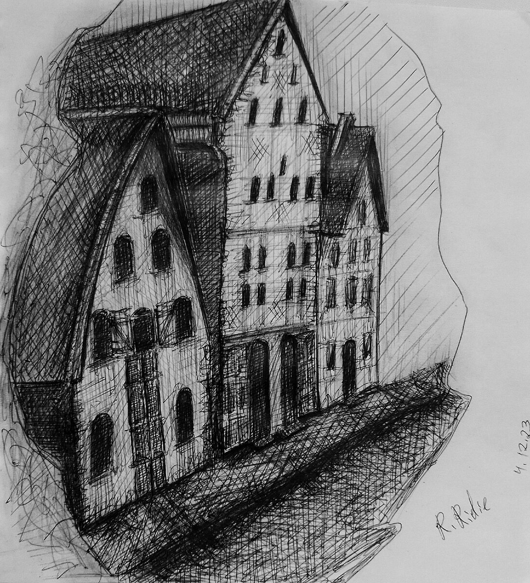 Это подлинные здания(рисунок по фото), историческое наследие, со своей особой красотой и эстетикой. Кому-то может показаться "мрачноватенько", но для меня подобная архитектура - просто бальзам на душу! 👌 Только представьте, сколько поколений там проживало!..👀😯