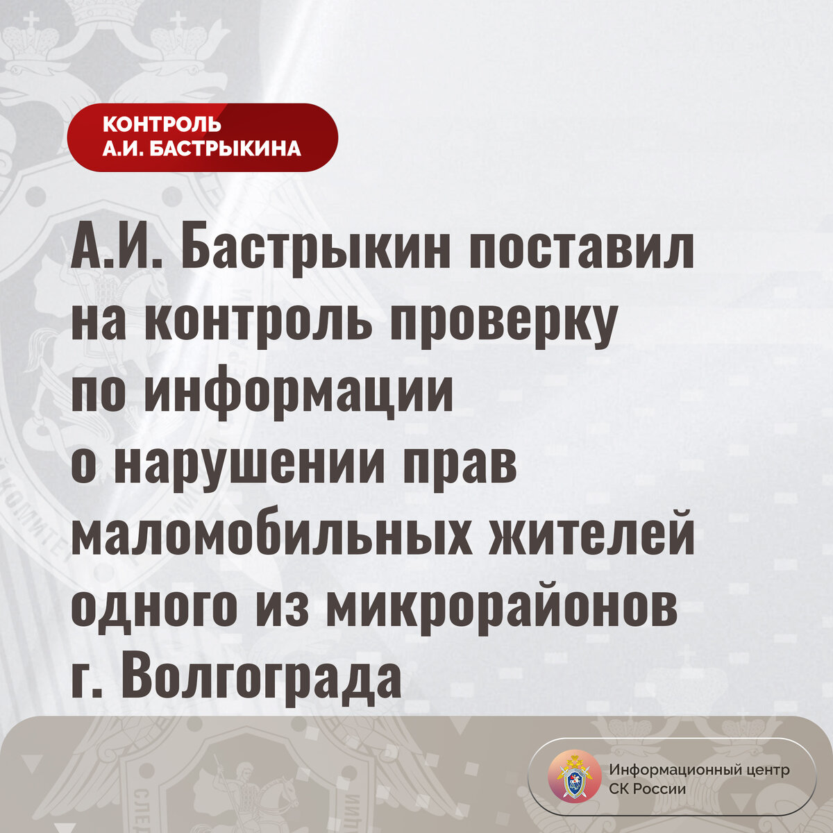 Председатель Следственного комитета Российской Федерации Александр Иванович Бастрыкин поручил руководителю СУ СК России по Волгоградской области Василию Ивановичу Семенову представить доклад о предварительных и окончательных результатах процессуальной проверки, поставив ее на контроль в центральн