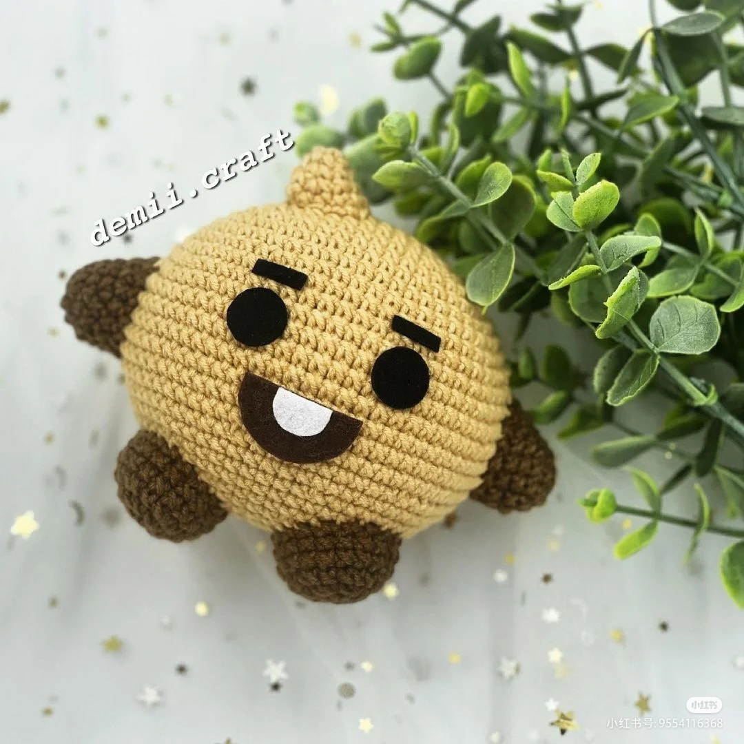 Тело 1. коричневым 9 ВП, со 2 от крючка: 7сб6, 3сбн в 1 петлю, 6сбн, пр 2. пр, 6сбн, 3 пр, 6сбн, 2 пр 3. сбн, пр, 6сбн, (сбн, пр)*3, 6сбн, (сбн, пр)*2 4. 2сбн, пр, 6сбн, (2сбн, пр)*3, 6сбн, (2сбн, пр)*2 5. 3сбн, пр, 6сбн, (3сбн, пр)*3, 6сбн, (3сбн, пр)*2 6. 4сбн, пр, 6сбн, (4сбн, пр)*3, 6сбн, (4сбн, пр)*2 7. 48сбн 8. 5сбн, пр, 6сбн, (5сбн, пр)*3, 6сбн, (5сбн, пр)*2 9. 54сбн 10. 6сбн, пр, 6сбн, (6сбн, пр)*3, 6сбн, (6сбн, пр)*2 11. 60сбн 12. 7сбн, пр, 6сбн, (7сбн, пр)*3, 6сбн, (7сбн, пр)*2 13-17. 66сбн 18. (9сбн, уб)*6 19. 60сбн 20. (8сбн, уб)*6 21. 54сбн 22. (7сбн, уб)*6 23. (6сбн, уб)*6 24. (5сбн, уб)*6 25. (4сбн, уб)*6 26. (3сбн, уб)*6 27. 12 уб Закрыть отверстие Волосы 1. цветом тела 3сбн в кольцо 2. 3 пр 3. (сбн, пр)*3 4. (2сбн, пр)*3 5. уб, 3сбн, 2 пр, 3сбн, уб Оставьте нить для пришивания Вырезать рот из черного фетра, брови, глаза. Диаметр глаза: 12 мм Ширина бровей: 12 мм Диаметр полукруга рта: черный большой полукруг 25 мм, белый маленький полукруг 12 мм Прик