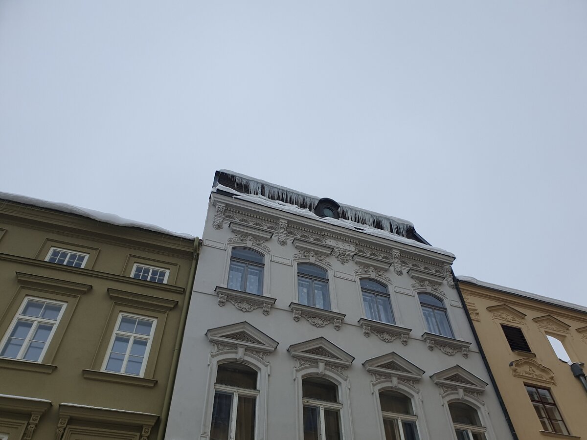 Снегопад это красиво, но есть последствие — сосульки! Особенно этим страдают старые дома Если ничего не далать, то рано или поздно гравитация им поможет переместится на тротуары. И если не повезет, то может крякнуться как эта мусорка. Конкркенто в эту мусорку я выношу мусор. И мне очень повезло, потому что я отошла на приличное расстояние, прежде чем туда прилетела сосулька. А сосульки у нас летают у нас знатные! Если вы видите вот такие смешные конструкции у стен, то лучше ходить по проезжей части. Это обозначение сосулько опасной зоны. Но такими вещами заморачиваются не все. В этом доме живут цыгане и им все равно на сосульки.