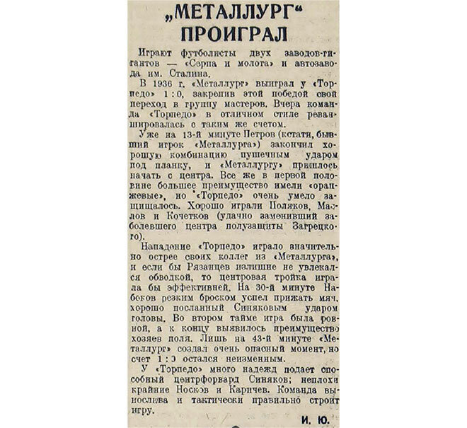 В 1936 г. «Металлург» выиграл у «Торпедо» 1:0, закрепив этой победой свой переход в группу мастеров. Вчера команда «Торпедо» в отличном стиле реваншировалась с таким же счетом. Уже на 13-й минуте Петров (кстати, бывший игрок «Металлурга») закончил хорошую комбинацию пушечным ударом под планку, и «Металлургу» пришлось начать с центра. Всё же в первой половине большее преимущество имели «оранжевые», но «Торпедо» очен