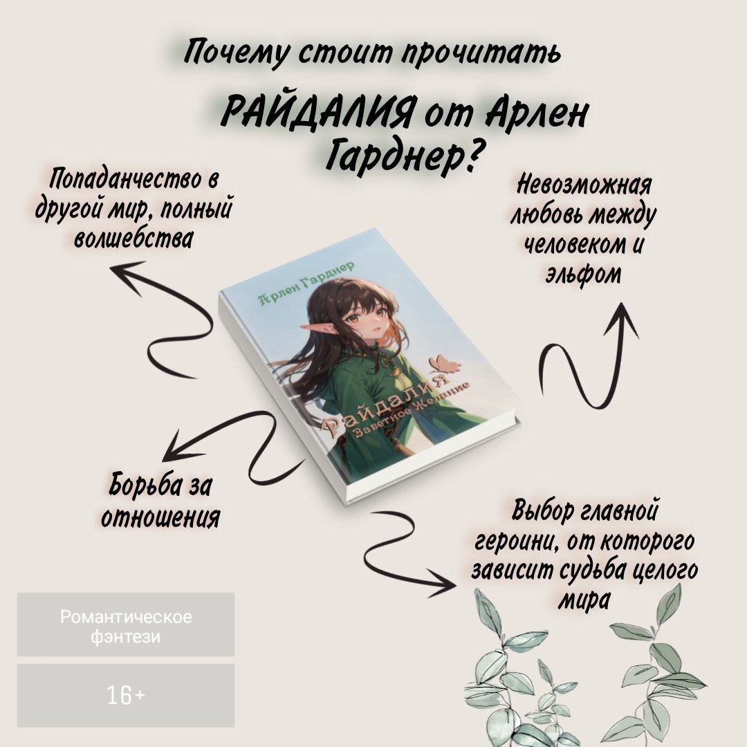 Новое романтическое фэнтези "Райдалия: Заветное Желание" от автора "Арлен Гарднер" уже доступно на Литнет и Ватпадд! ♡♡♡♡♡♡♡♡♡♡♡♡♡♡♡ Возрастное ограничение: 16+ ♡Аннотация♡ "У меня была мечта, заветная и недостижимая. В свой день рождения я в шутку загадала её. И она сбылась. Я попала в фантастический мир. Вот только пришлось скрываться, ведь иначе жители убьют меня. Мало мне было проблем - я еще и влюбилась. Мы полные противоположности из разных миров и рас. События принимают неожиданый оборот, на город нападают. По кругу царит хаос. Передо мной стоит выбор - вернуться домой или остаться и попытаться спасти Райдалию?" Выбор между горем и смертью. Выбор между семьей и любимыми. Выбор между мирами. В её руках судьба всех. Что же выберет Вероника?.. ♡♡♡♡♡♡♡♡♡♡♡♡♡♡♡ Ссылки на книгу ⬇️ ВАТПАДД ЛИТНЕТ Приятного чтения и не забывайте оставлять свои отзывы ❤