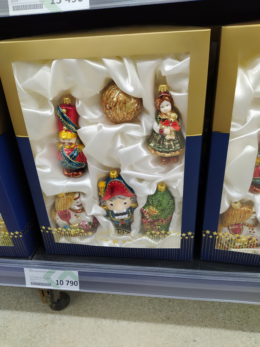 А тогда я обалдела даже от скидочных цен. Но от красоты игрушек обалдела ещё больше. Сейчас понимаю, что больше всего меня зацепили игрушки украинской "Ирены". И как бы меня жаба не душила, но из магазина я ушла с коробкой набора "Щелкунчик" из 6-и игрушек за 1990 рублей. Это уже со скидкой набор стоил столько. В прошлом году в магазине было очень пусто, сильно сократились стеллажи с игрушками. А в этом году всё вроде оживело. Много китайский игрушек, есть немецкий "Кребс", а на смену "Ирене" пришла "Маруся". Я так понимаю, что таким макаром обходятся санкции, потому что "Маруся" по сути та же "Ирена", только произведённая в Сербии. И даже есть мой набор в продаже, только стоит он сегодня 10790 рублей