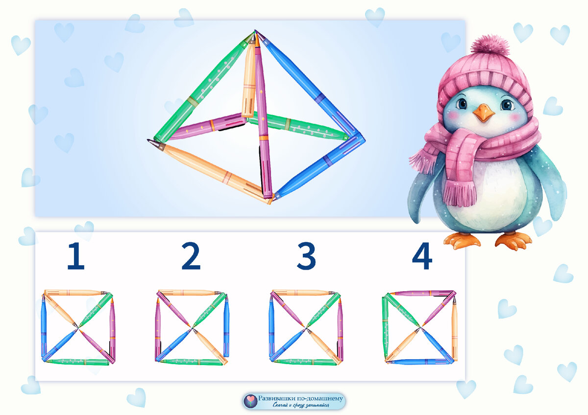 Помоги пингвинёнку ответить, какой вид сверху подходит для пирамидки из ручек Деда Мороза, которыми он подписывает свои письма